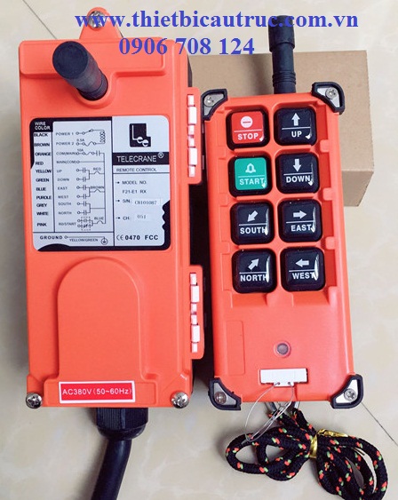 Điều khiển từ xa Telecrane F21-E1B gồm có bộ thu sóng và bộ phát sóng, bộ phát sóng (tay bấm điều khiển) có 6 nút điều khiển 1 cấp tốc độ và nút Start + nút Stop.
